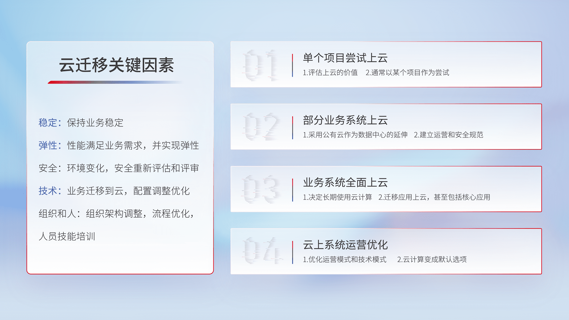 结合实际业务,,,从规划设计、、云平台选型、、、云原生改造、、数据迁移、、、、集成交付,,迁移全过程为客户识别最佳上云路径,,,,做好风险识别管理,,,设计网络架构、、身份权限、、、、安全审计合规、、操作审计、、、日志审计、、、监控告警策略、、、、多站点容灾设计等,,,,对云上基础设施进行整体规划,,提升IT治理水平,,,,以满足弹性、、、高可用、、高性能的需求。。。。