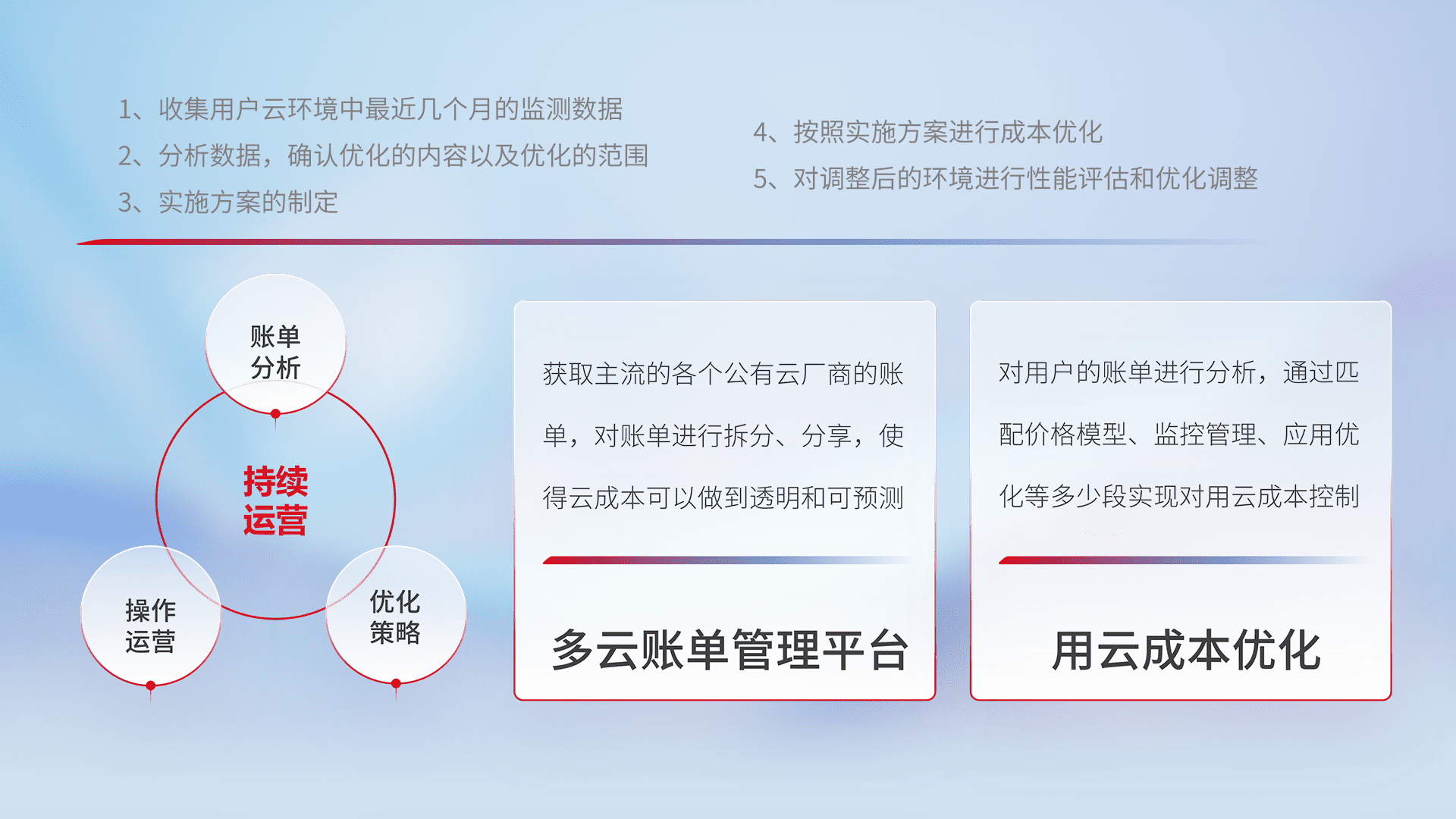 通过多云纳管,,以统一的资源数据模型把客户的云资源进行抽象和封装,,,进而实现对多云资源的统一操作,,,保障云资源管理的可靠性、、稳定性与可用性。。。量身定制化运维内容,,,配置、、、、开发运维、、补丁管理、、备份、、、、监控、、、、认证和访问管理、、、、审计和日常巡检等,,,,保障在用云过程中的可靠度,,稳定度以及高可用率。。。