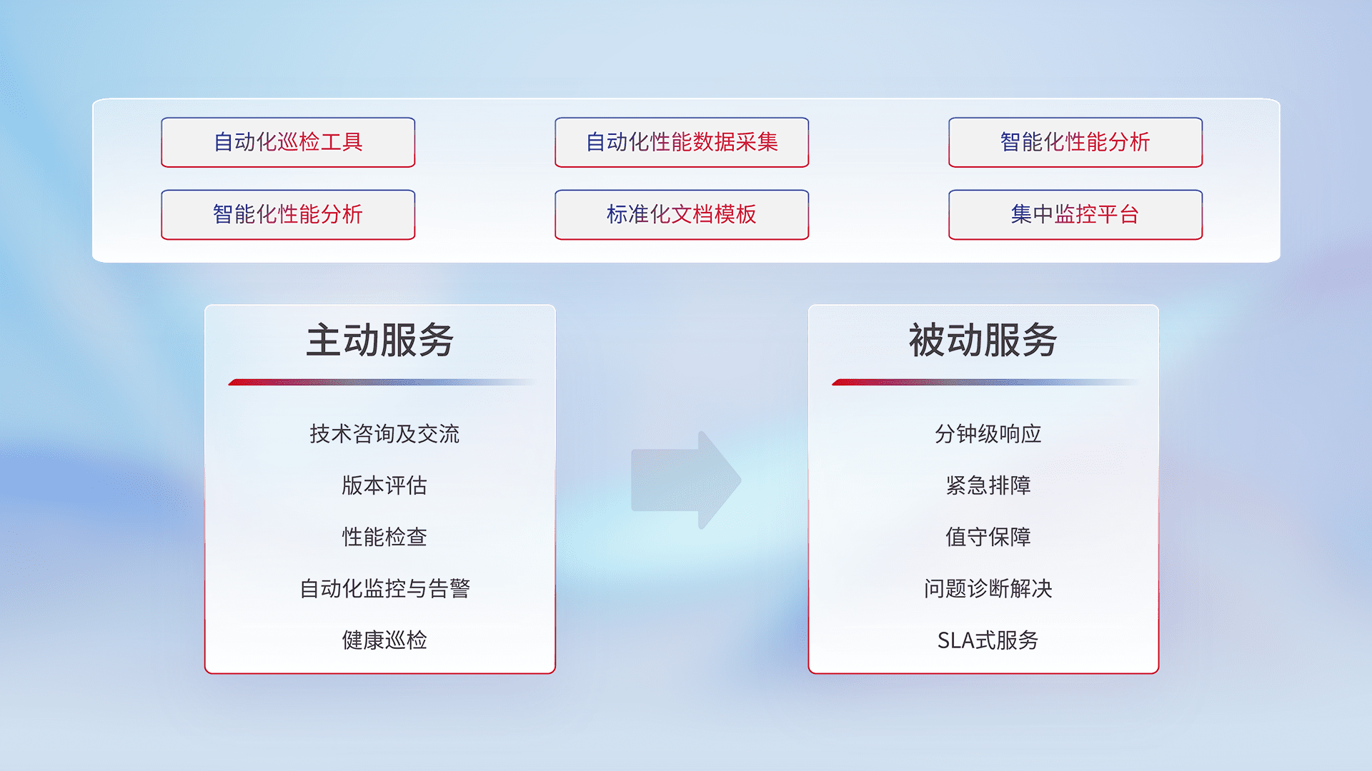 智能化工具和标准化文档,,,,保障服务质量,,提供主动服务(包含技术咨询、、、、版本评估、、性能检查、、自动化监控与告警、、、健康巡检)和被动服务包含(分钟级响应、、、紧急排障、、值守保障、、问题诊断解决、、、、SLA服务)。。。
