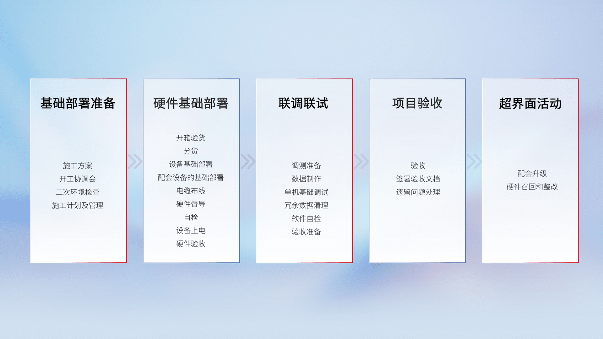 从基础部署准备、、硬件基础部署、、、、联调联试、、项目验收、、、、越界面活动的全过程可追溯,,,保证施工质量和进度。。