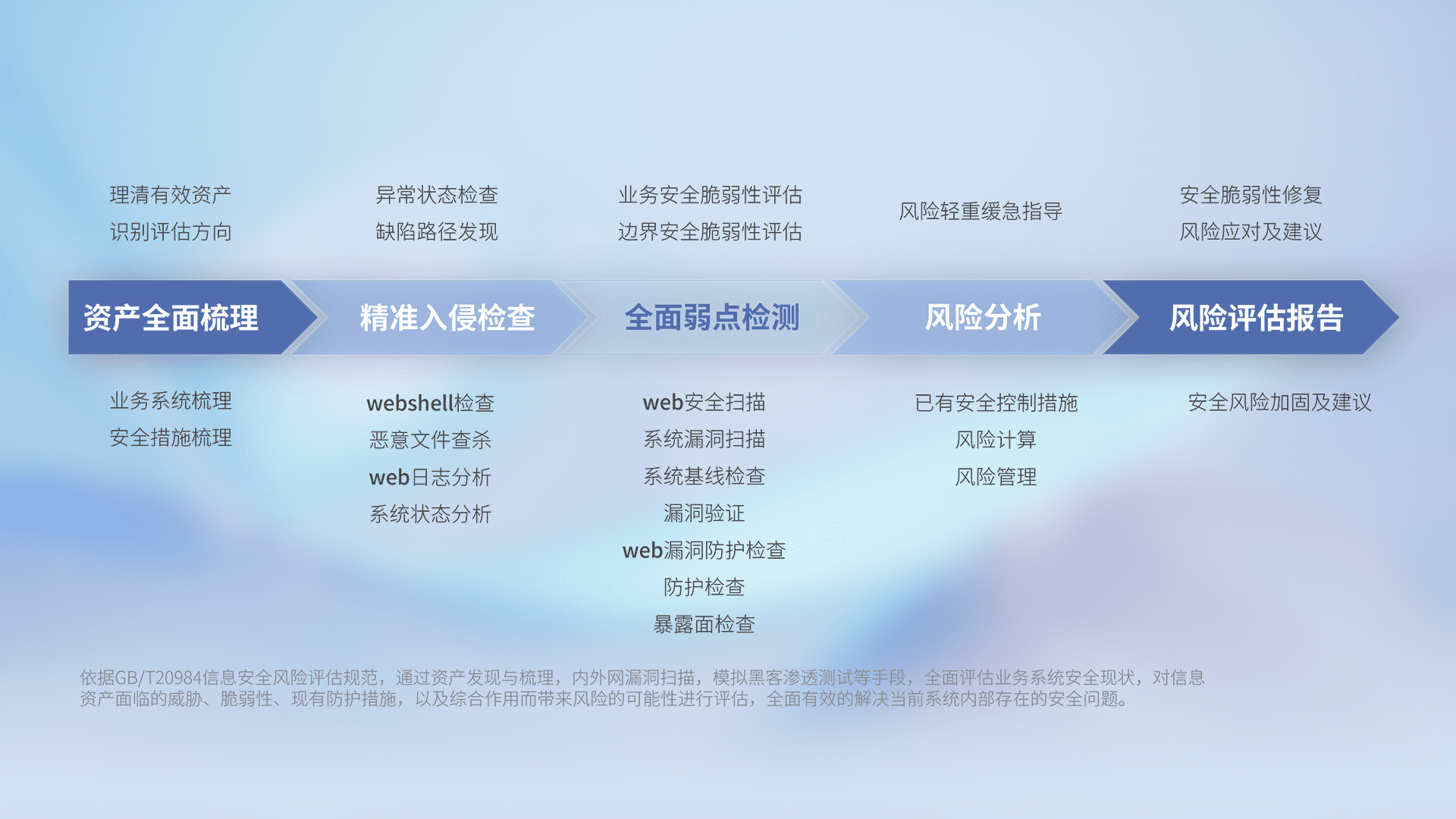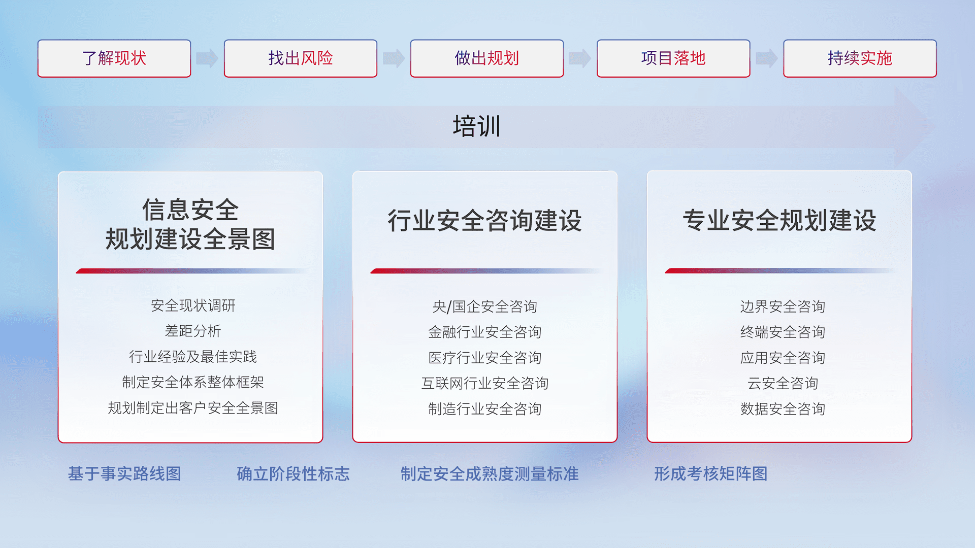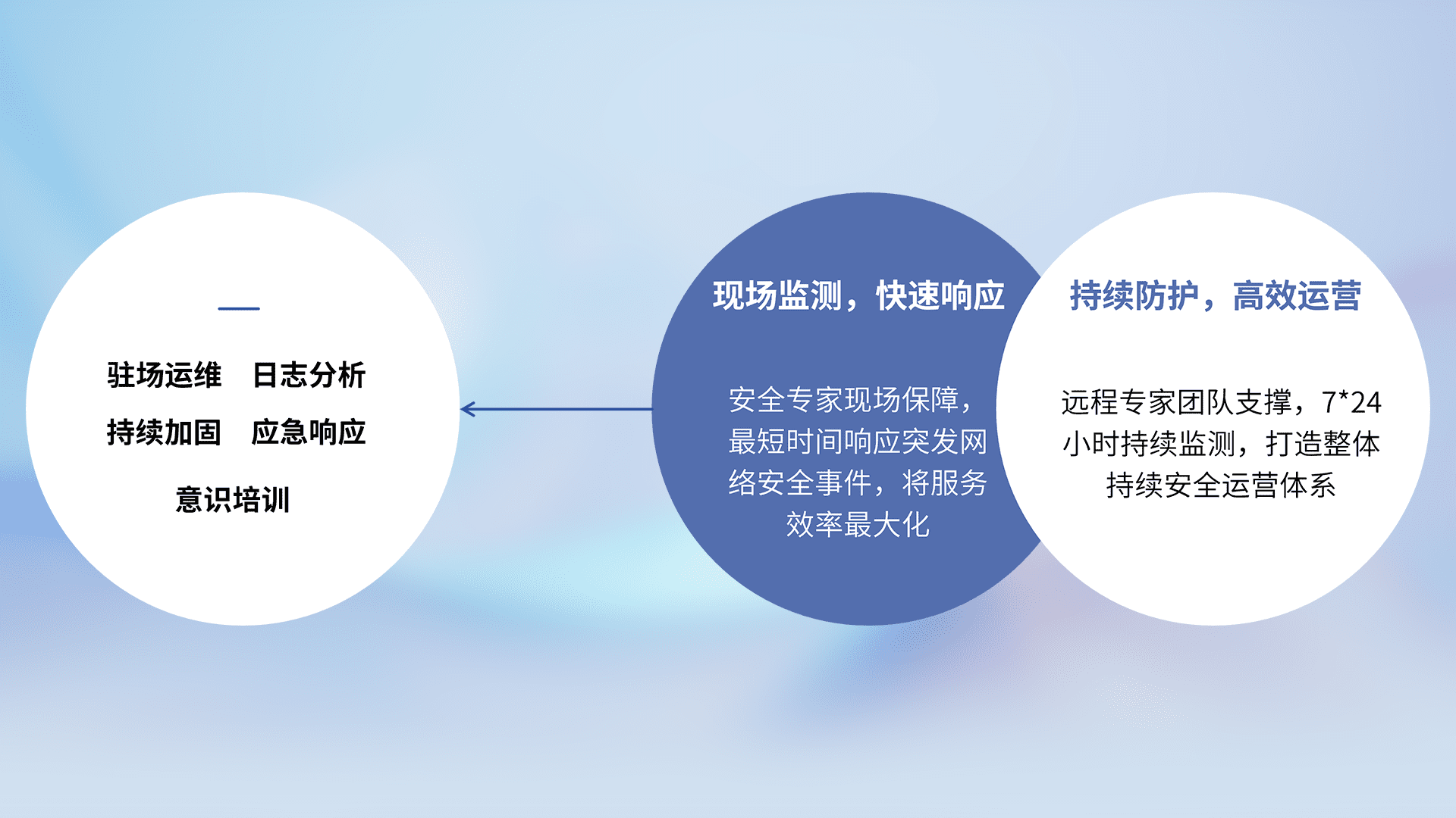 针对客户行业特性,,,以专业的安全服务+多厂商联合解决方案提供专属的一站式安全管理服务,,,,帮助客户全面感知网络空间威胁,,,,基于识别、、、、检测、、、分析、、防护、、监测、、、响应的服务理论模型,,,,从方案咨询、、、集成交付、、、评估验证、、优化加固、、、运维运营,,致力于为客户提供完整的闭环管理式安全服务。。以实战经验为客户打造高抵御风险的安全体系,,帮助客户发现威胁、、、、对抗威胁、、处置威胁,,,不断积累安全对抗能力,,持续保障数字化安全。。